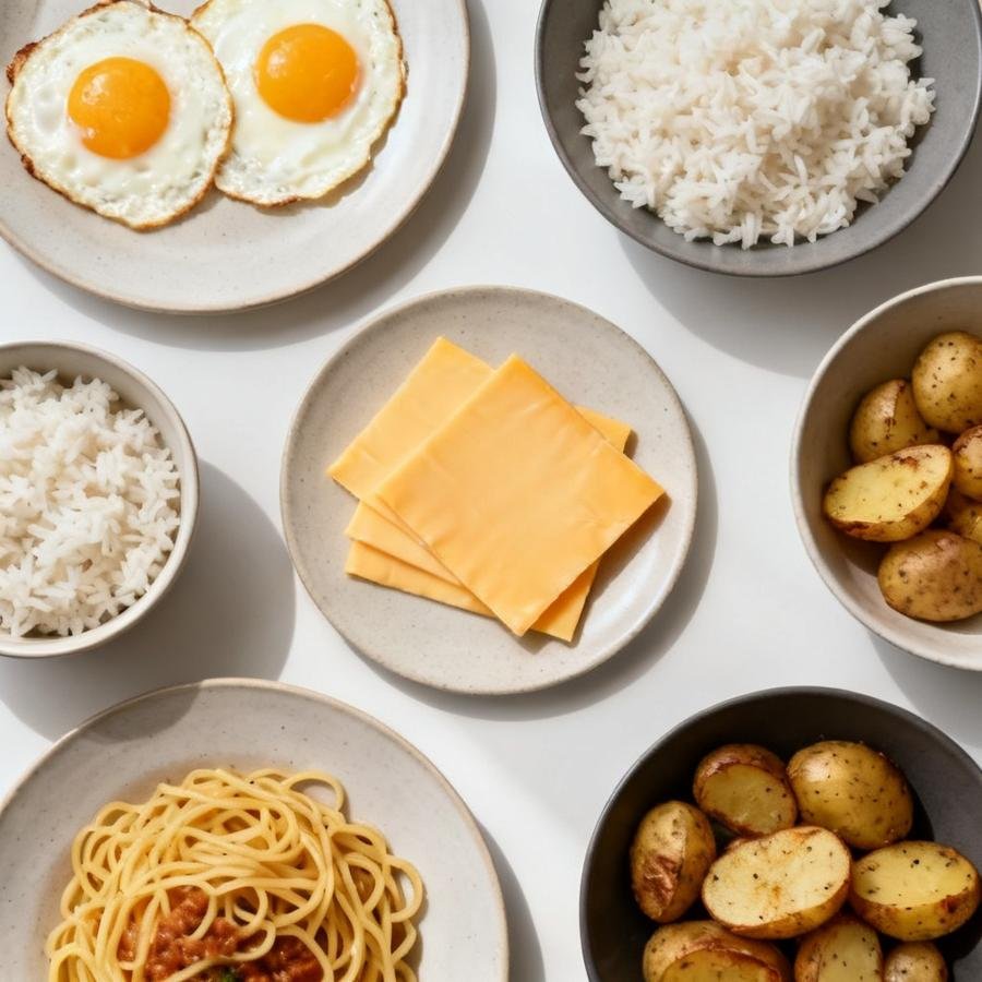 مكرونة بالصلصة مع بيض مسلوق، أو عجة البطاطس والبيض مع الأرز الأبيض.