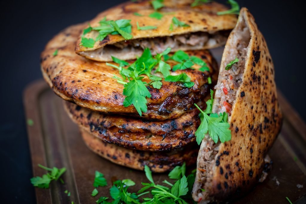 - الحشو: افردي كرة من العجين، وضعي فوقها كمية من اللحم المتبل، ثم غطيها بقطعة عجين أخرى واغلقي الأطراف جيداً.
